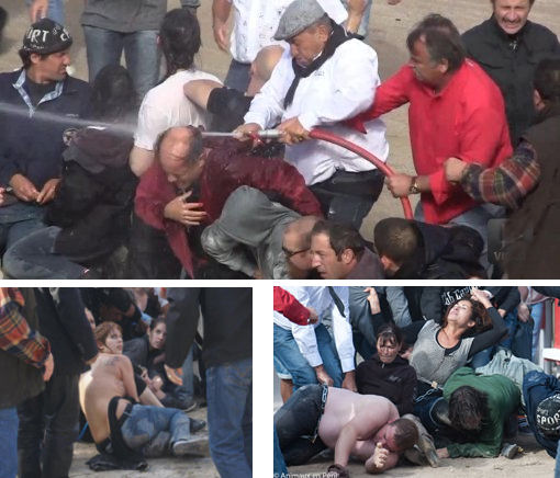 Pour finir avec Rodilhan, c’est justement là qu’en 2011 des dizaines d’aficionados ont longuement roué de coups 70 anticorridas assis et enchaînés au milieu de l’arène. Personne parmi les manifestants n’a répliqué aux coups ni aux agressions sexuelles dont ont été victimes des militantes.