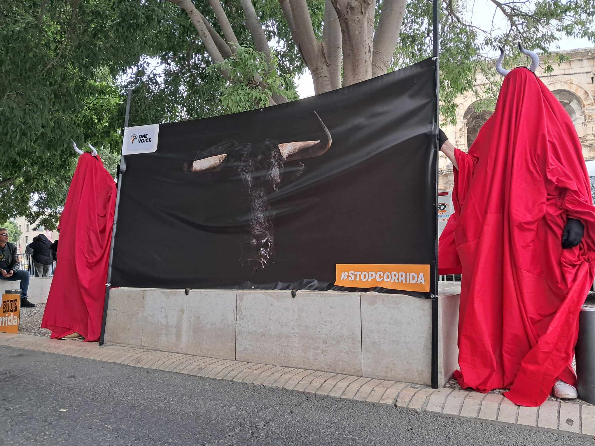 L’action principale coordonnée de notre association s’est déroulée à proximité des arènes à 17 heures 30 avec des visuels dénonçant le paradoxe français : une écrasante majorité de la population qui rejette la corrida et curieusement une absence de décision politique pour que cesse le carnage.