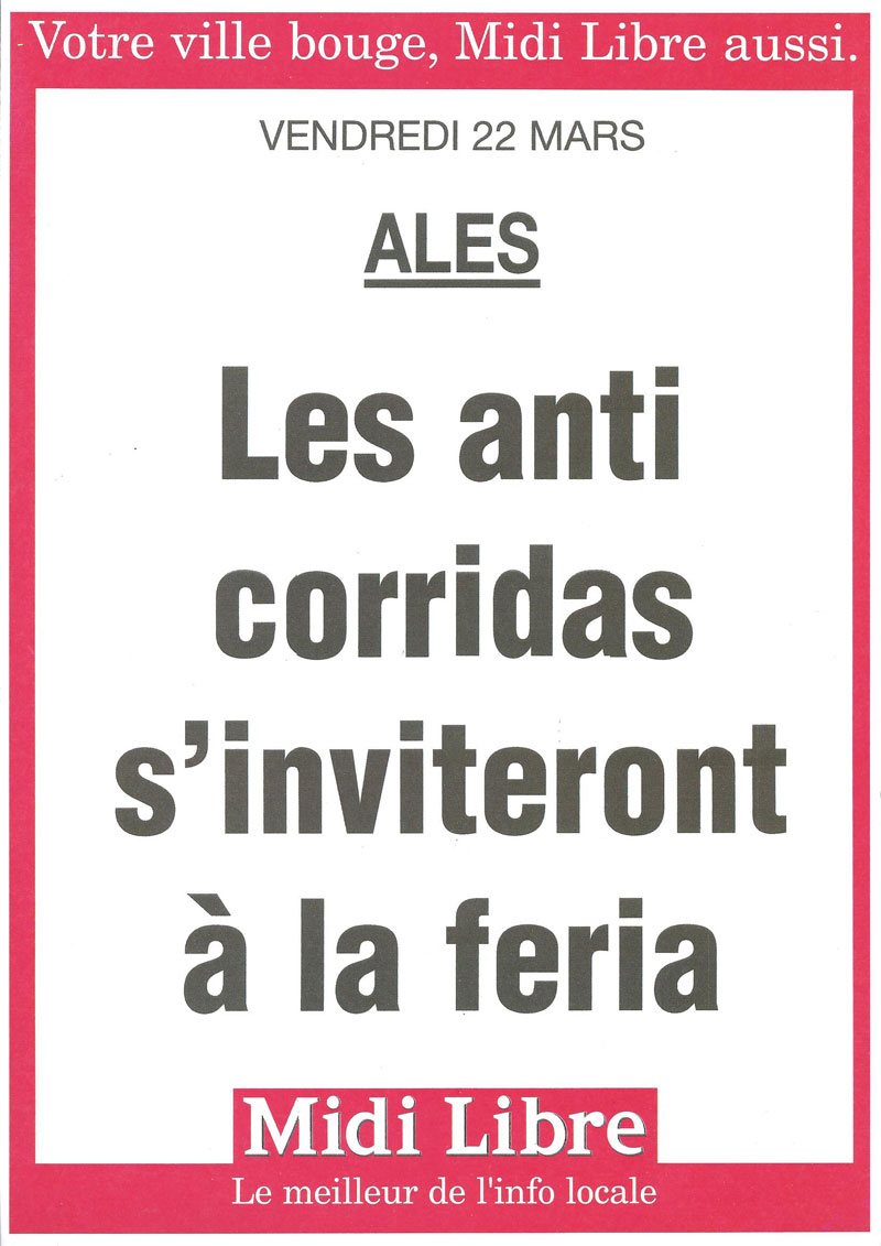 Merci d’envoyer de nombreux messages (courriers électroniques, téléphone, fax) afin de faire comprendre au prestataire de sévices, Philippe Cuillé, qu’il n’est pas le bienvenu (voir notre lettre ouverte) à Alès, et pour demander à Max Roustan, maire d’Alès de faire un dernier effort pour en finir enfin avec la torture tauromachique. Soyons fermes et courtois […]Lire la suite +