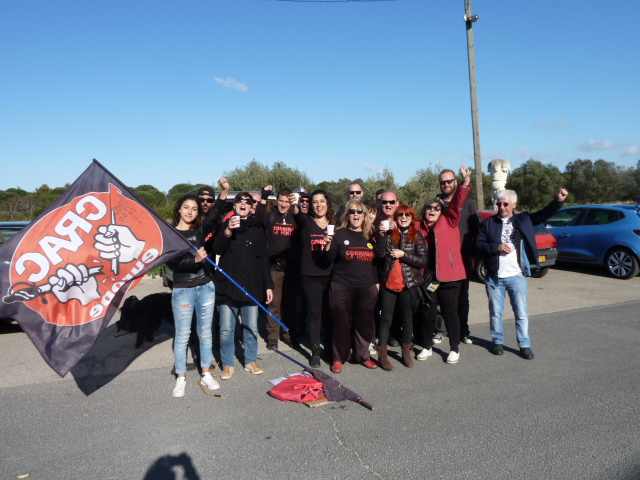 Banderoles, pancartes et drapeaux envahirent rapidement le rond point et les abords des différentes intersections. Sur la Marche Funèbre de Chopin, des tracts furent distribués à bon nombre d’automobilistes pendant presque 4 heures. Tout ceci encadré par une quinzaine de gendarmes qui étaient présents pour notre sécurité. Car oui, ils l’ont bien compris, les violences et agressions viennent bien du camp adverse.